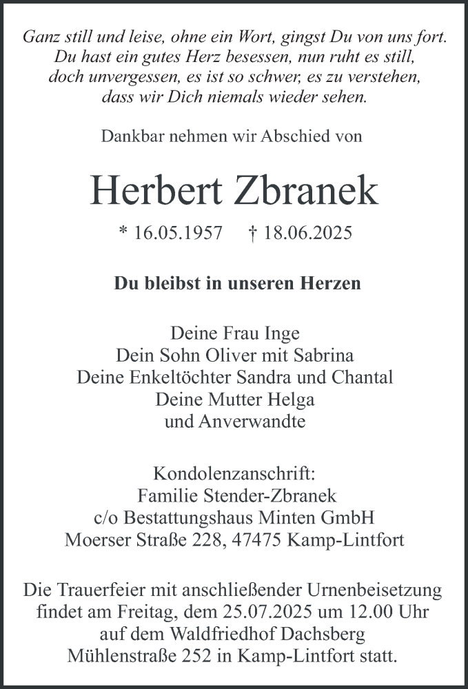 Hier finden Sie alle Traueranzeigen aus der Zeitung, die bisher für Herbert Zbranek erschienen sind. Weitere Traueranzeigen, die in der Zeitung erscheinen, werden hier ebenfalls aufgelistet