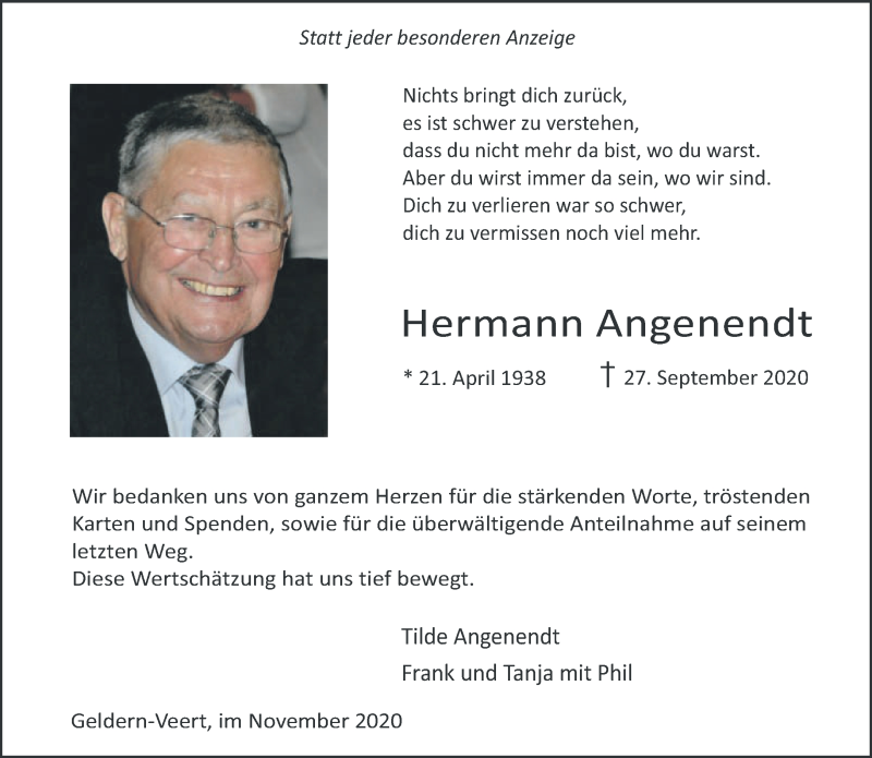 Hier finden Sie alle Traueranzeigen aus der Zeitung, die bisher für Hermann Angenendt erschienen sind. Weitere Traueranzeigen, die in der Zeitung erscheinen, werden hier ebenfalls aufgelistet