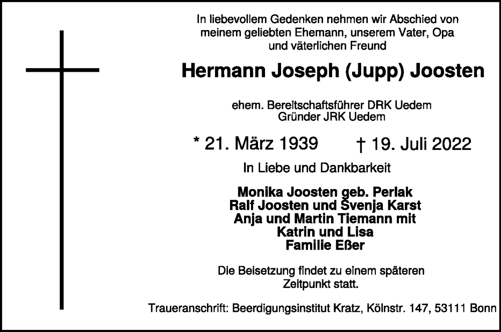 Hier finden Sie alle Traueranzeigen aus der Zeitung, die bisher für Hermann Joseph Joosten erschienen sind. Weitere Traueranzeigen, die in der Zeitung erscheinen, werden hier ebenfalls aufgelistet