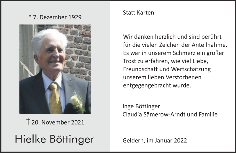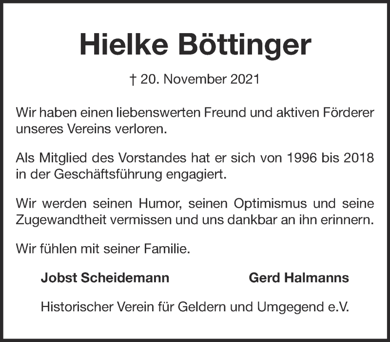 Hier finden Sie alle Traueranzeigen aus der Zeitung, die bisher für Hielke Böttinger erschienen sind. Weitere Traueranzeigen, die in der Zeitung erscheinen, werden hier ebenfalls aufgelistet