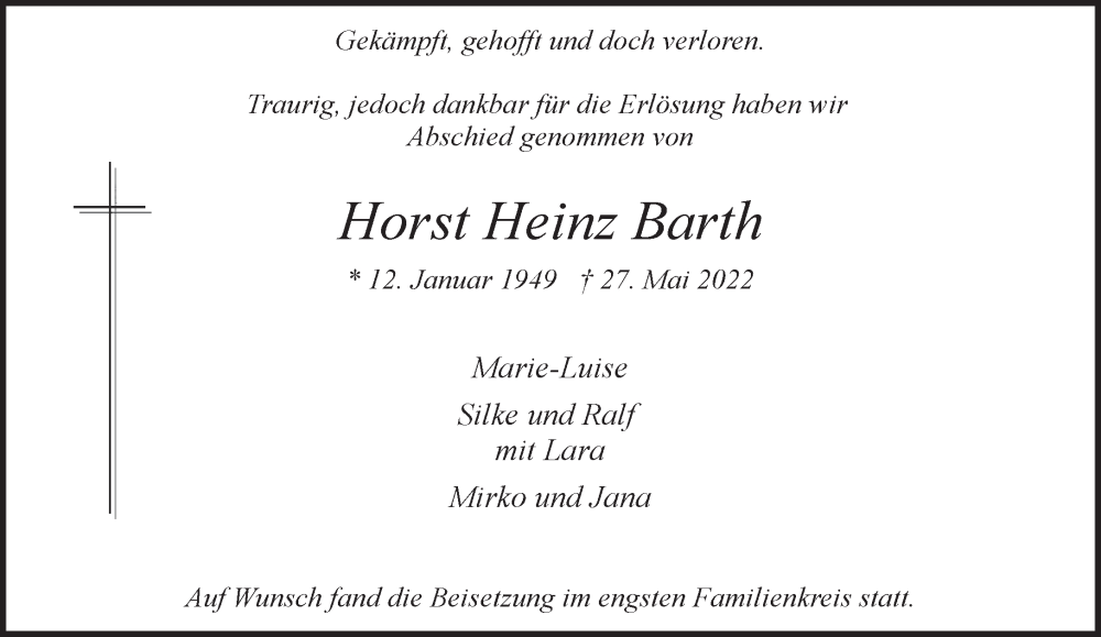 Hier finden Sie alle Traueranzeigen aus der Zeitung, die bisher für Horst Heinz Barth erschienen sind. Weitere Traueranzeigen, die in der Zeitung erscheinen, werden hier ebenfalls aufgelistet