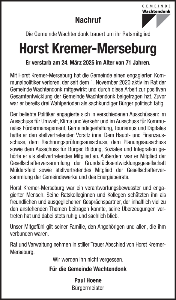 Hier finden Sie alle Traueranzeigen aus der Zeitung, die bisher für Horst Kremer-Merseburg erschienen sind. Weitere Traueranzeigen, die in der Zeitung erscheinen, werden hier ebenfalls aufgelistet