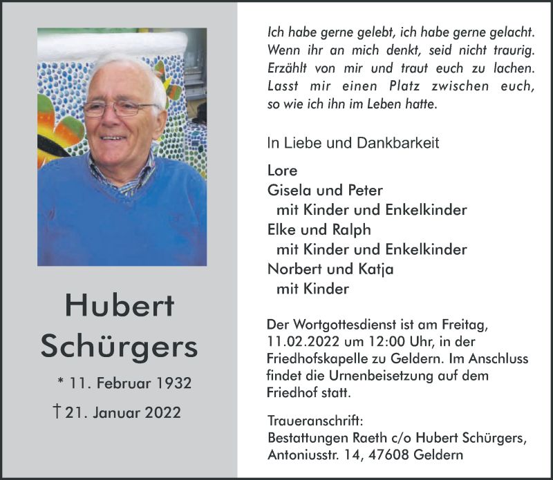 Hier finden Sie alle Traueranzeigen aus der Zeitung, die bisher für Hubert Schürgers erschienen sind. Weitere Traueranzeigen, die in der Zeitung erscheinen, werden hier ebenfalls aufgelistet