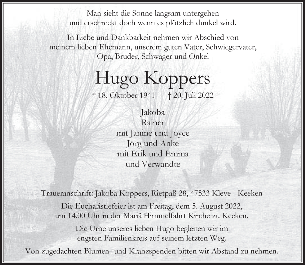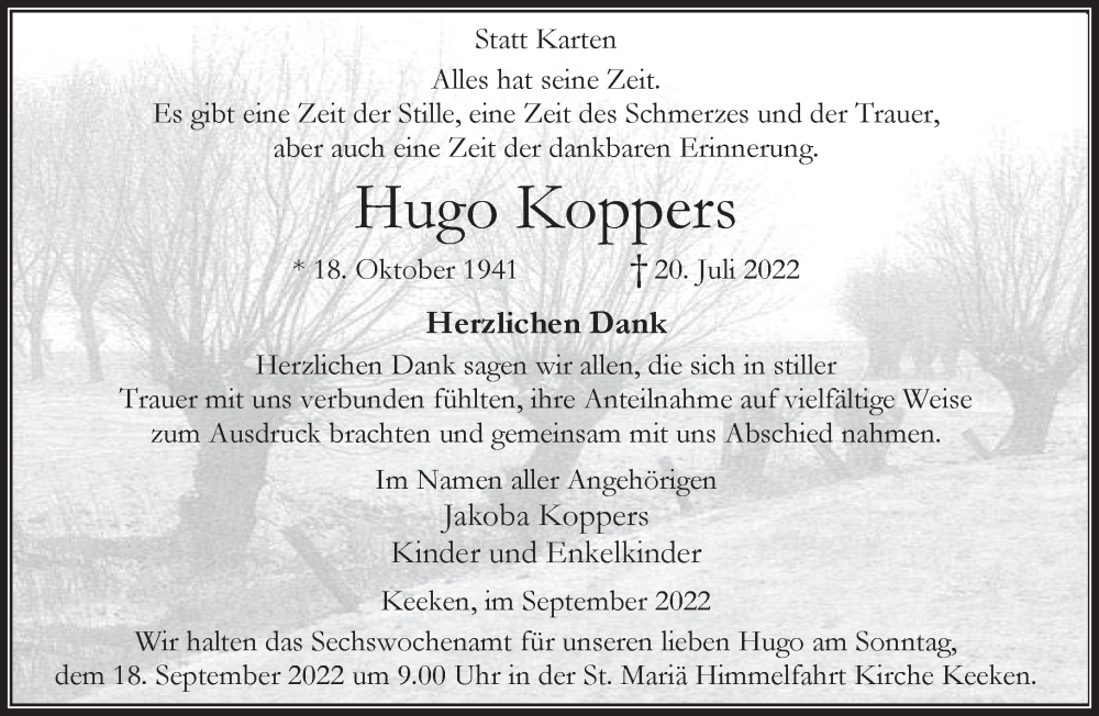 Hier finden Sie alle Traueranzeigen aus der Zeitung, die bisher für Hugo Koppers erschienen sind. Weitere Traueranzeigen, die in der Zeitung erscheinen, werden hier ebenfalls aufgelistet