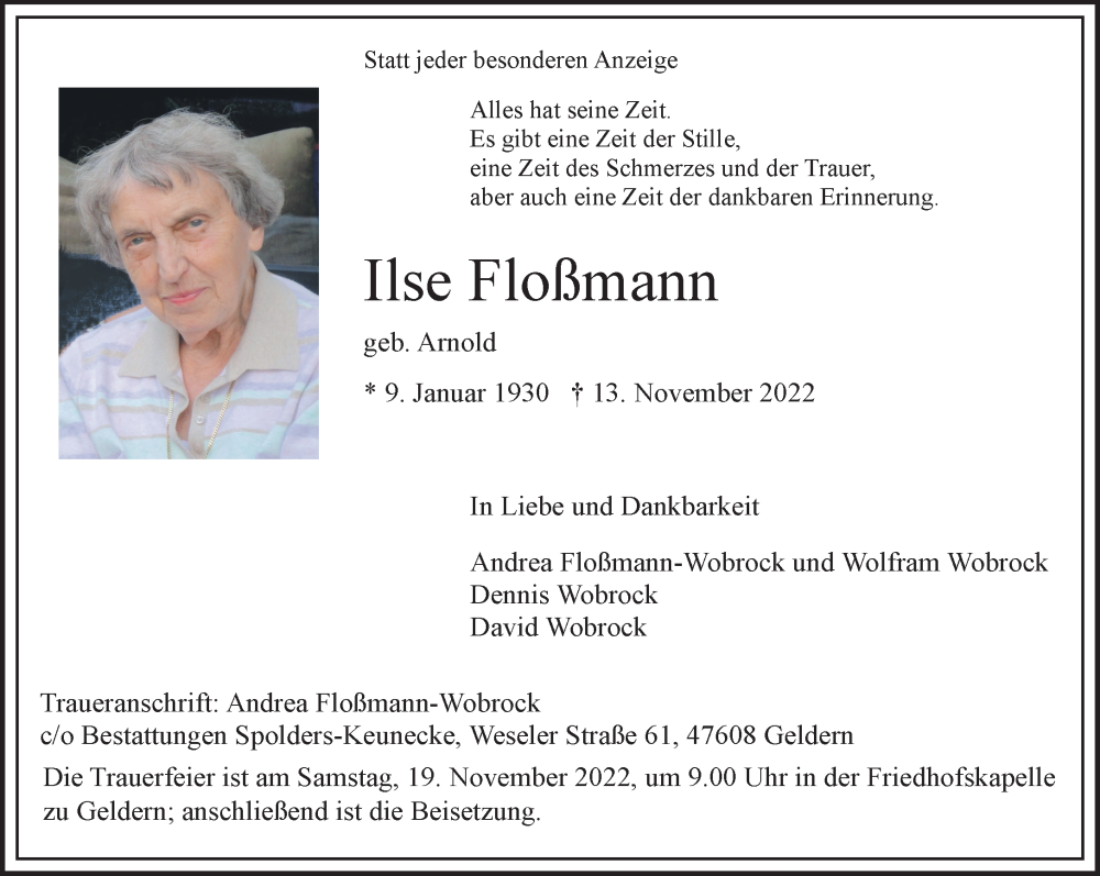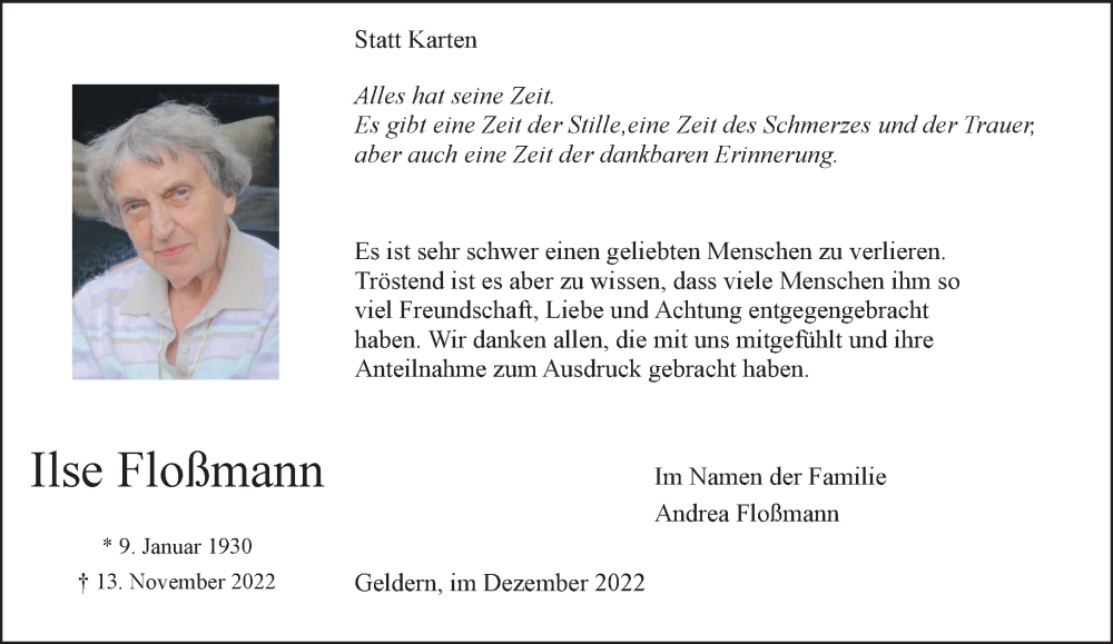 Hier finden Sie alle Traueranzeigen aus der Zeitung, die bisher für Ilse Floßmann erschienen sind. Weitere Traueranzeigen, die in der Zeitung erscheinen, werden hier ebenfalls aufgelistet