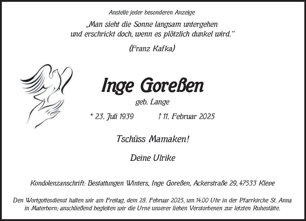 Hier finden Sie alle Traueranzeigen aus der Zeitung, die bisher für Inge Goreßen erschienen sind. Weitere Traueranzeigen, die in der Zeitung erscheinen, werden hier ebenfalls aufgelistet