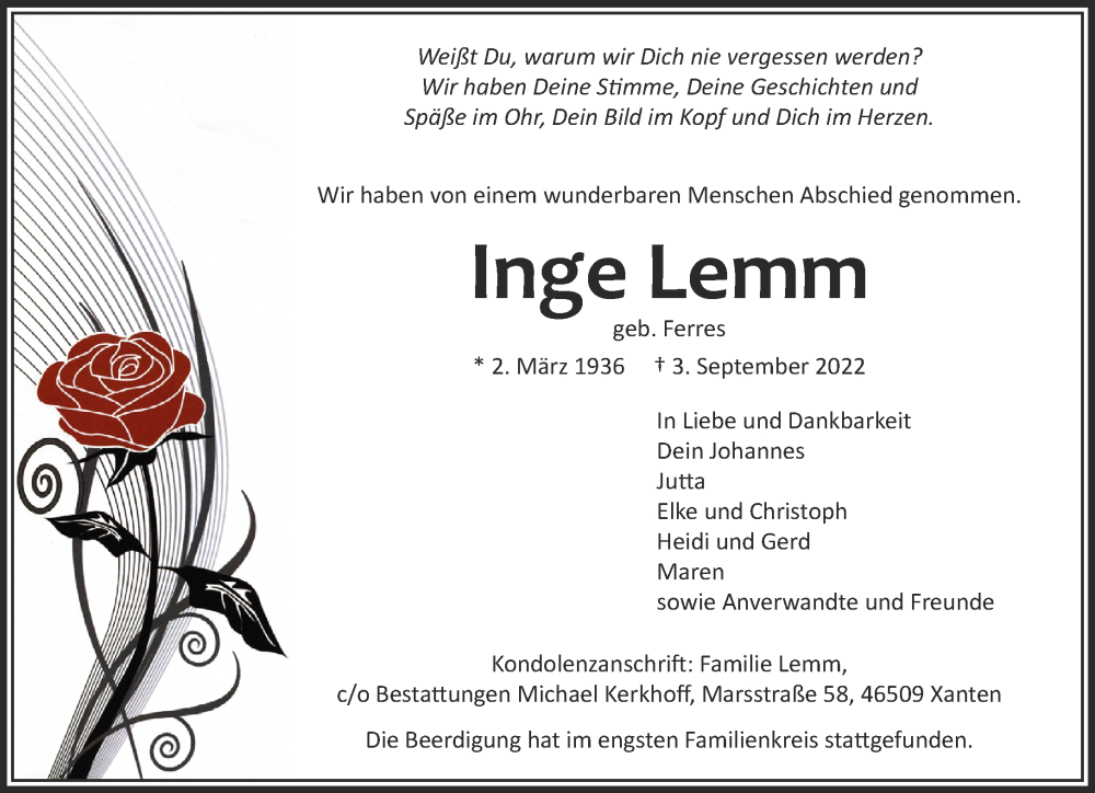 Hier finden Sie alle Traueranzeigen aus der Zeitung, die bisher für Inge Lemm erschienen sind. Weitere Traueranzeigen, die in der Zeitung erscheinen, werden hier ebenfalls aufgelistet