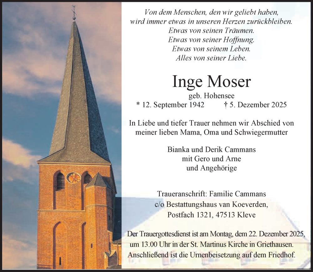 Hier finden Sie alle Traueranzeigen aus der Zeitung, die bisher für Inge Moser erschienen sind. Weitere Traueranzeigen, die in der Zeitung erscheinen, werden hier ebenfalls aufgelistet