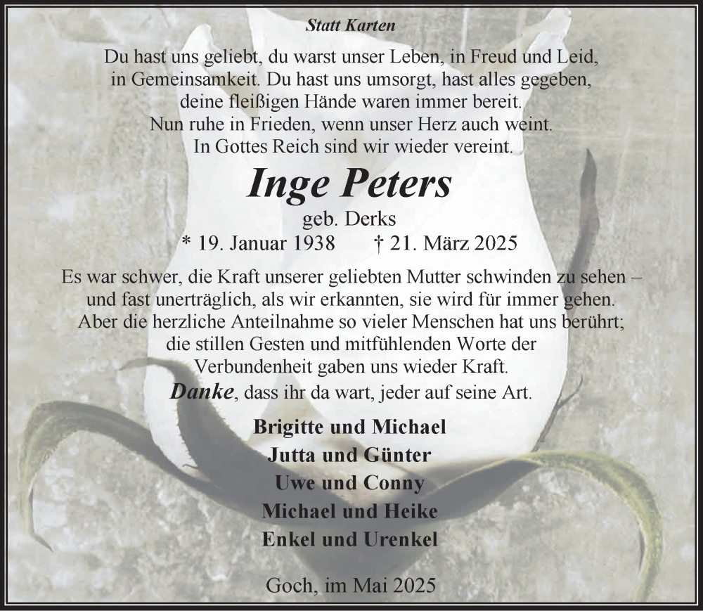 Hier finden Sie alle Traueranzeigen aus der Zeitung, die bisher für Inge Peters erschienen sind. Weitere Traueranzeigen, die in der Zeitung erscheinen, werden hier ebenfalls aufgelistet