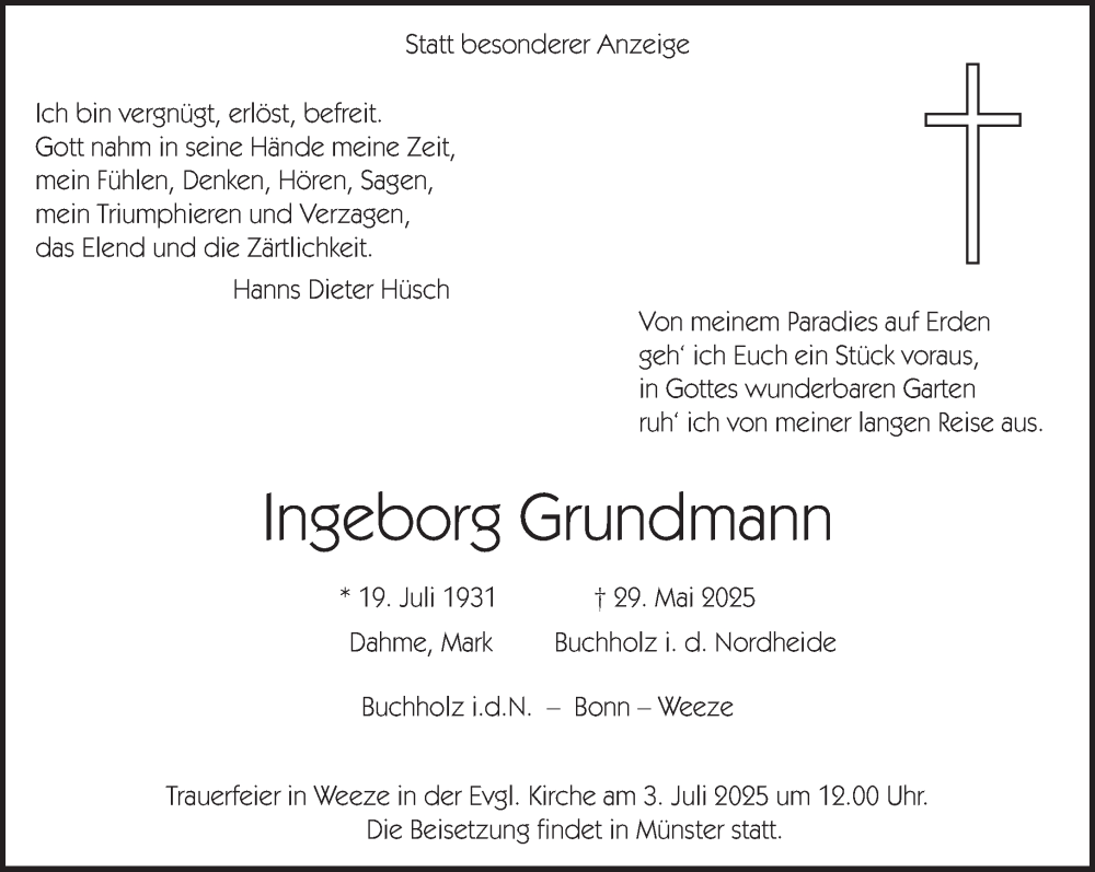 Hier finden Sie alle Traueranzeigen aus der Zeitung, die bisher für Ingeborg Grundmann erschienen sind. Weitere Traueranzeigen, die in der Zeitung erscheinen, werden hier ebenfalls aufgelistet