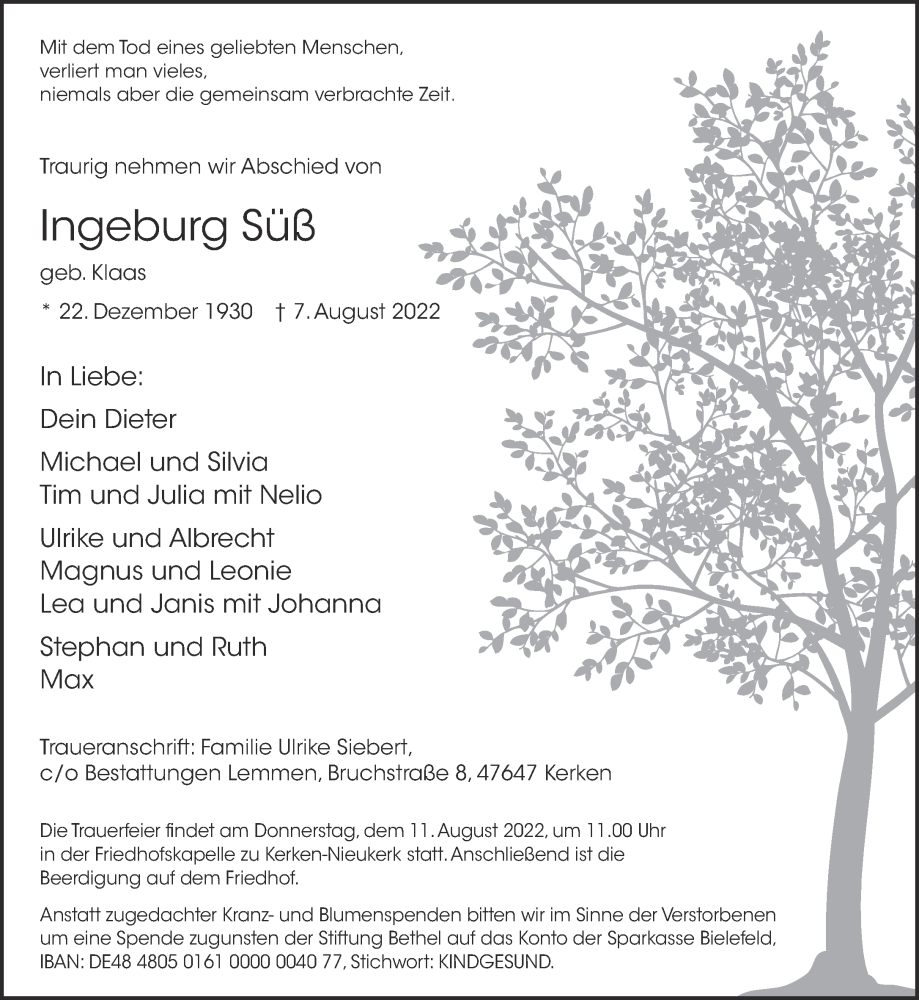 Hier finden Sie alle Traueranzeigen aus der Zeitung, die bisher für Ingeburg Süß erschienen sind. Weitere Traueranzeigen, die in der Zeitung erscheinen, werden hier ebenfalls aufgelistet