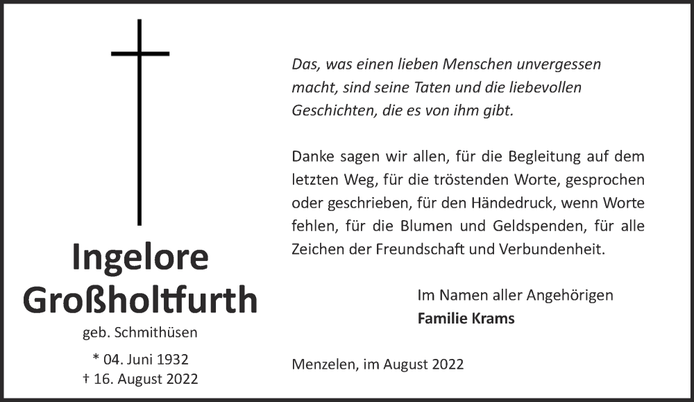 Hier finden Sie alle Traueranzeigen aus der Zeitung, die bisher für Ingelore Großholtfurth erschienen sind. Weitere Traueranzeigen, die in der Zeitung erscheinen, werden hier ebenfalls aufgelistet