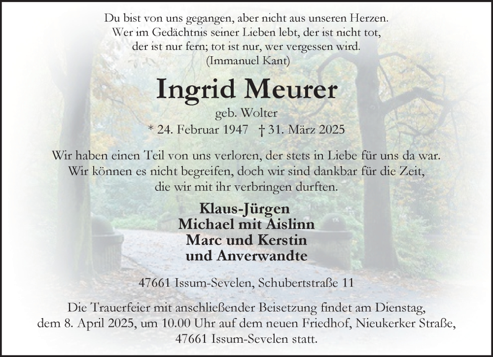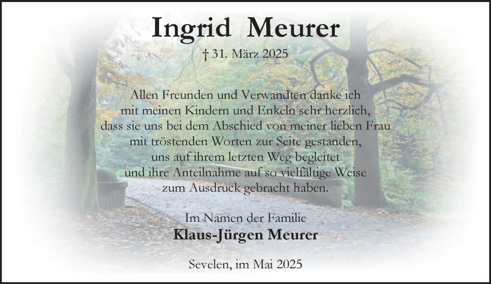 Hier finden Sie alle Traueranzeigen aus der Zeitung, die bisher für Ingrid Meurer erschienen sind. Weitere Traueranzeigen, die in der Zeitung erscheinen, werden hier ebenfalls aufgelistet