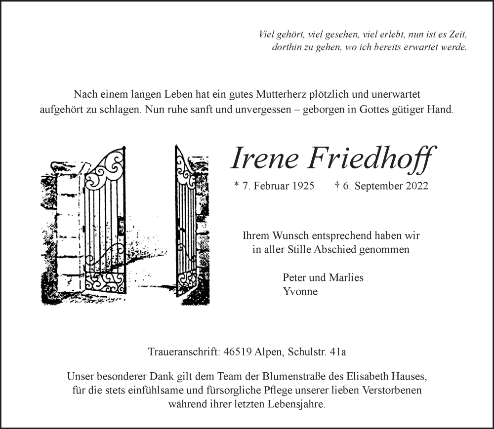 Hier finden Sie alle Traueranzeigen aus der Zeitung, die bisher für Irene Friedhoff erschienen sind. Weitere Traueranzeigen, die in der Zeitung erscheinen, werden hier ebenfalls aufgelistet