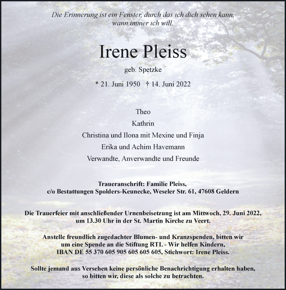 Hier finden Sie alle Traueranzeigen aus der Zeitung, die bisher für Irene Pleiss erschienen sind. Weitere Traueranzeigen, die in der Zeitung erscheinen, werden hier ebenfalls aufgelistet