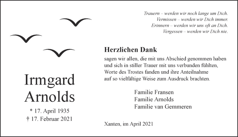 Hier finden Sie alle Traueranzeigen aus der Zeitung, die bisher für Irmgard Arnolds erschienen sind. Weitere Traueranzeigen, die in der Zeitung erscheinen, werden hier ebenfalls aufgelistet