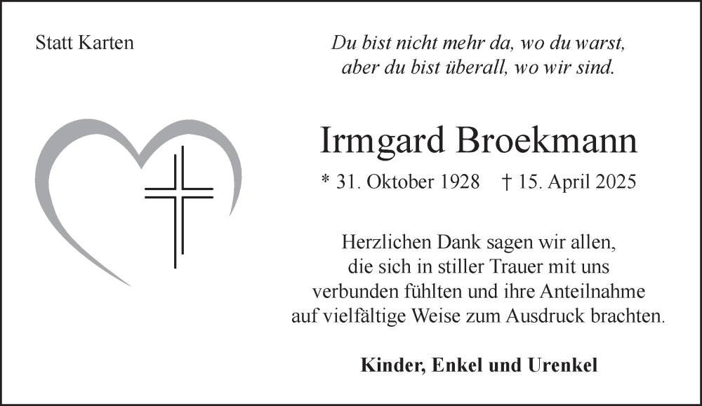 Hier finden Sie alle Traueranzeigen aus der Zeitung, die bisher für Irmgard Broekmann erschienen sind. Weitere Traueranzeigen, die in der Zeitung erscheinen, werden hier ebenfalls aufgelistet