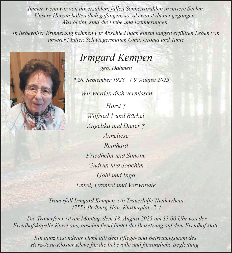 Hier finden Sie alle Traueranzeigen aus der Zeitung, die bisher für Irmgard Kempen erschienen sind. Weitere Traueranzeigen, die in der Zeitung erscheinen, werden hier ebenfalls aufgelistet