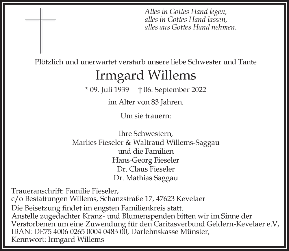 Hier finden Sie alle Traueranzeigen aus der Zeitung, die bisher für Irmgard Willems erschienen sind. Weitere Traueranzeigen, die in der Zeitung erscheinen, werden hier ebenfalls aufgelistet