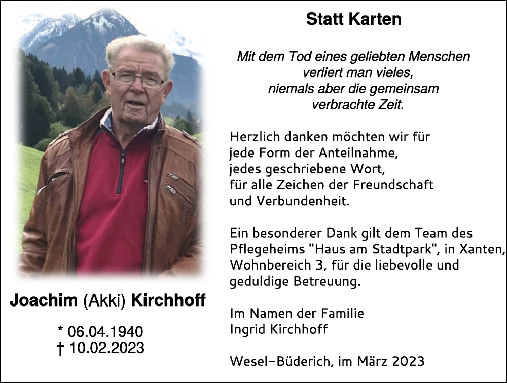 Hier finden Sie alle Traueranzeigen aus der Zeitung, die bisher für Joachim Kirchhoff erschienen sind. Weitere Traueranzeigen, die in der Zeitung erscheinen, werden hier ebenfalls aufgelistet