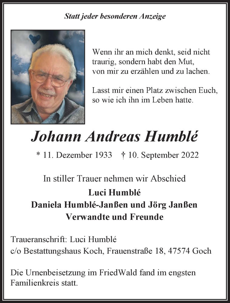 Hier finden Sie alle Traueranzeigen aus der Zeitung, die bisher für Johann Andreas Humblé erschienen sind. Weitere Traueranzeigen, die in der Zeitung erscheinen, werden hier ebenfalls aufgelistet