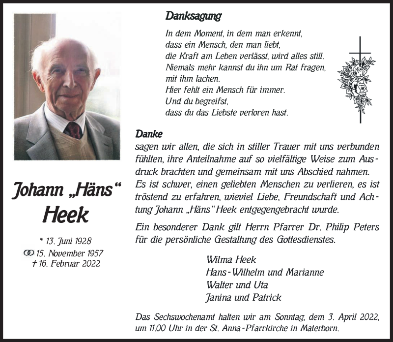 Hier finden Sie alle Traueranzeigen aus der Zeitung, die bisher für Johann Heek erschienen sind. Weitere Traueranzeigen, die in der Zeitung erscheinen, werden hier ebenfalls aufgelistet
