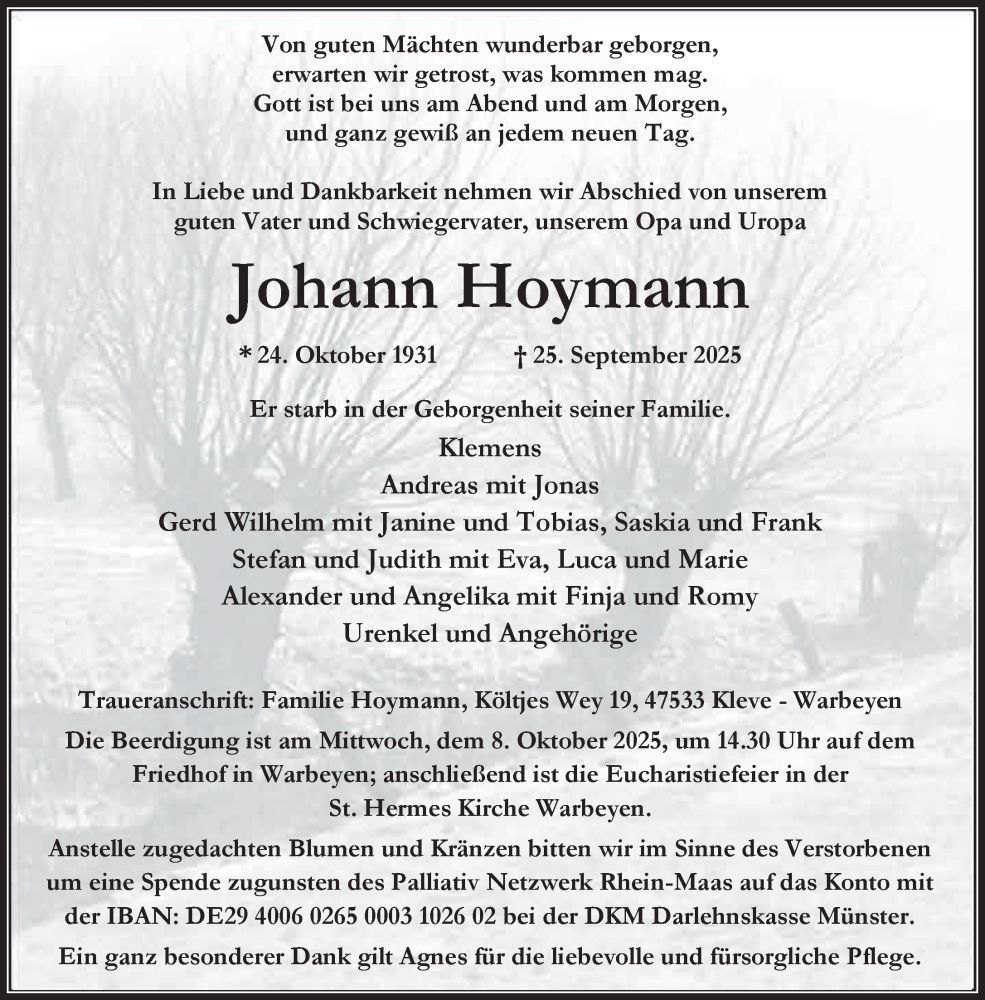 Hier finden Sie alle Traueranzeigen aus der Zeitung, die bisher für Johann Hoymann erschienen sind. Weitere Traueranzeigen, die in der Zeitung erscheinen, werden hier ebenfalls aufgelistet
