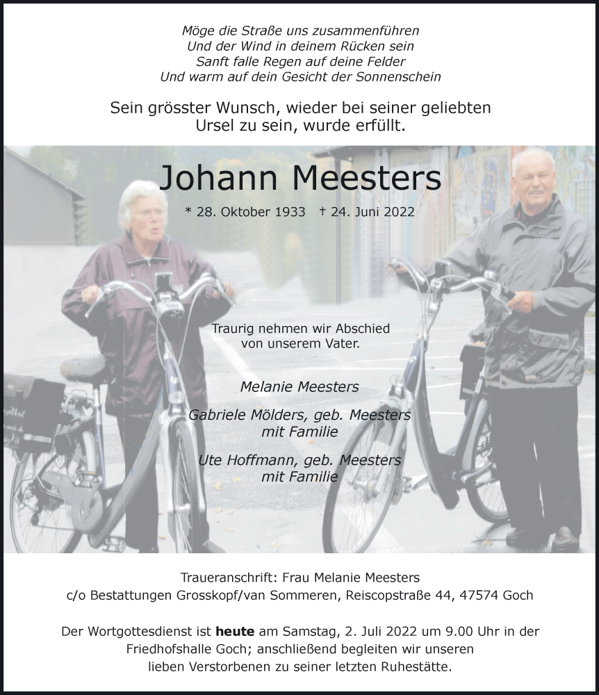Hier finden Sie alle Traueranzeigen aus der Zeitung, die bisher für Johann Meesters erschienen sind. Weitere Traueranzeigen, die in der Zeitung erscheinen, werden hier ebenfalls aufgelistet