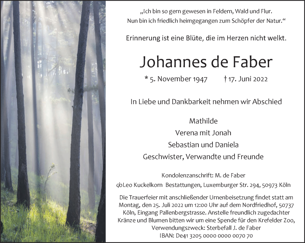 Hier finden Sie alle Traueranzeigen aus der Zeitung, die bisher für Johannes de Faber erschienen sind. Weitere Traueranzeigen, die in der Zeitung erscheinen, werden hier ebenfalls aufgelistet