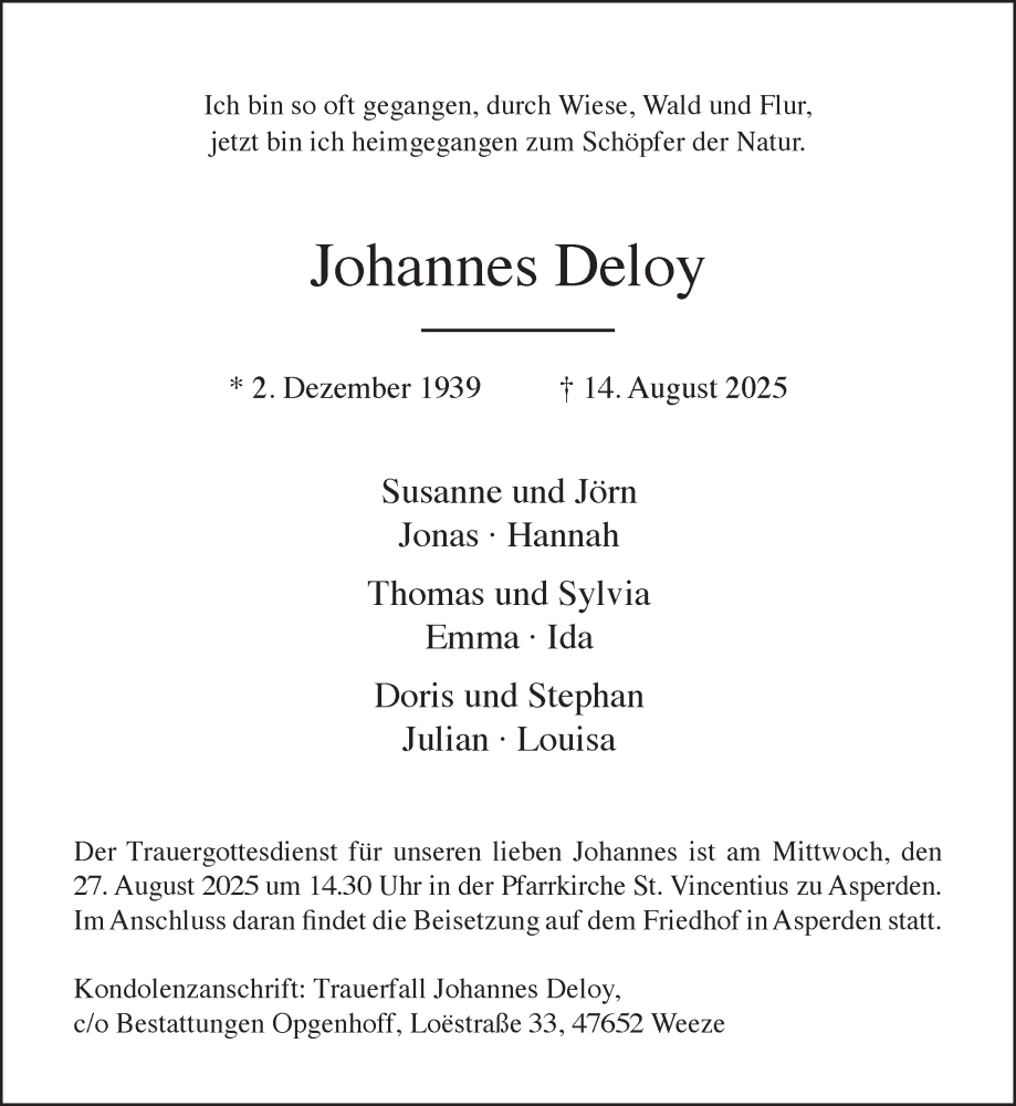 Hier finden Sie alle Traueranzeigen aus der Zeitung, die bisher für Johannes Deloy erschienen sind. Weitere Traueranzeigen, die in der Zeitung erscheinen, werden hier ebenfalls aufgelistet
