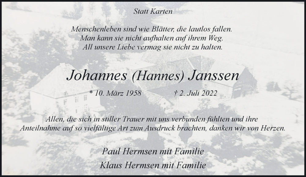 Hier finden Sie alle Traueranzeigen aus der Zeitung, die bisher für Johannes Janssen erschienen sind. Weitere Traueranzeigen, die in der Zeitung erscheinen, werden hier ebenfalls aufgelistet