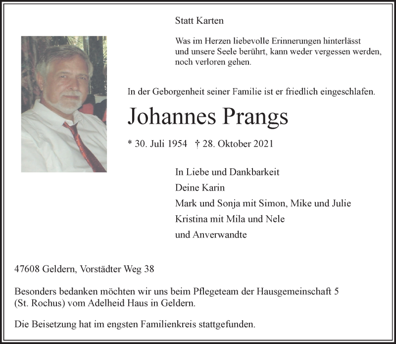 Hier finden Sie alle Traueranzeigen aus der Zeitung, die bisher für Johannes Prangs erschienen sind. Weitere Traueranzeigen, die in der Zeitung erscheinen, werden hier ebenfalls aufgelistet