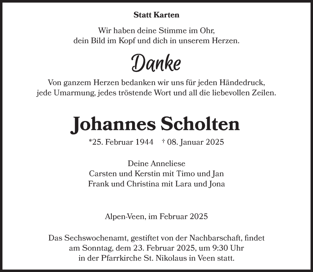 Hier finden Sie alle Traueranzeigen aus der Zeitung, die bisher für Johannes Scholten erschienen sind. Weitere Traueranzeigen, die in der Zeitung erscheinen, werden hier ebenfalls aufgelistet