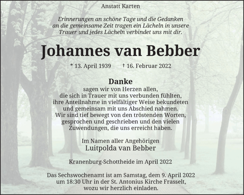 Hier finden Sie alle Traueranzeigen aus der Zeitung, die bisher für Johannes van Bebber erschienen sind. Weitere Traueranzeigen, die in der Zeitung erscheinen, werden hier ebenfalls aufgelistet