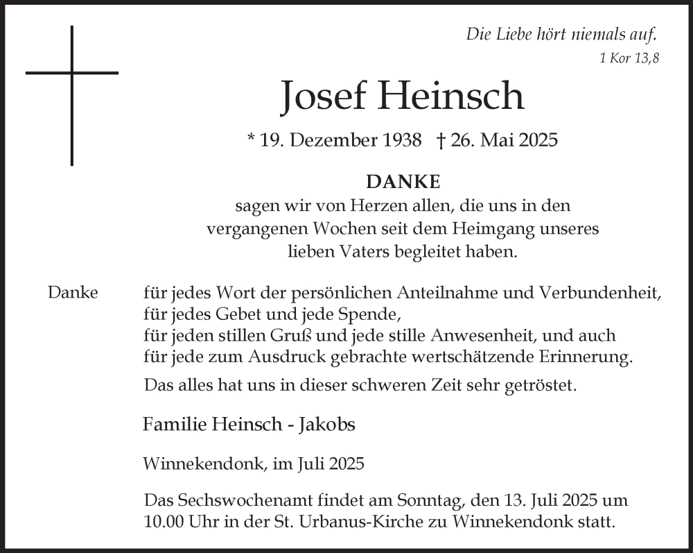 Hier finden Sie alle Traueranzeigen aus der Zeitung, die bisher für Josef Heinsch erschienen sind. Weitere Traueranzeigen, die in der Zeitung erscheinen, werden hier ebenfalls aufgelistet