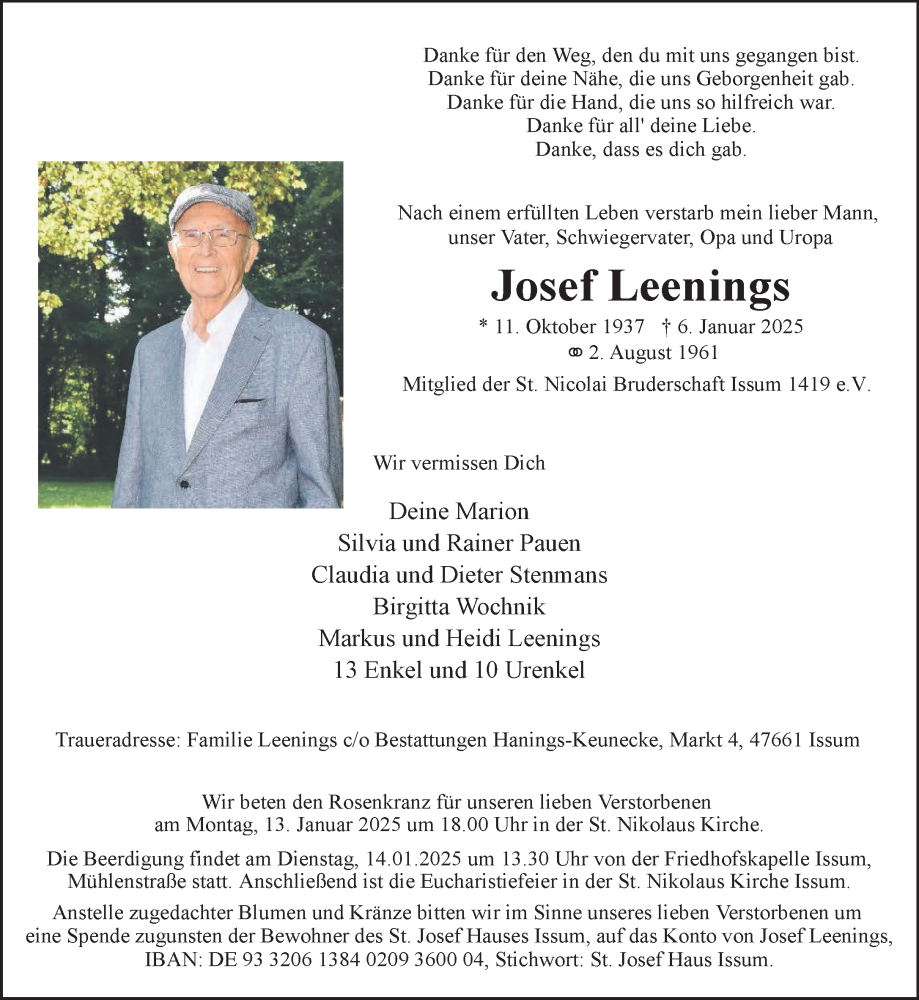 Hier finden Sie alle Traueranzeigen aus der Zeitung, die bisher für Josef Leenings erschienen sind. Weitere Traueranzeigen, die in der Zeitung erscheinen, werden hier ebenfalls aufgelistet