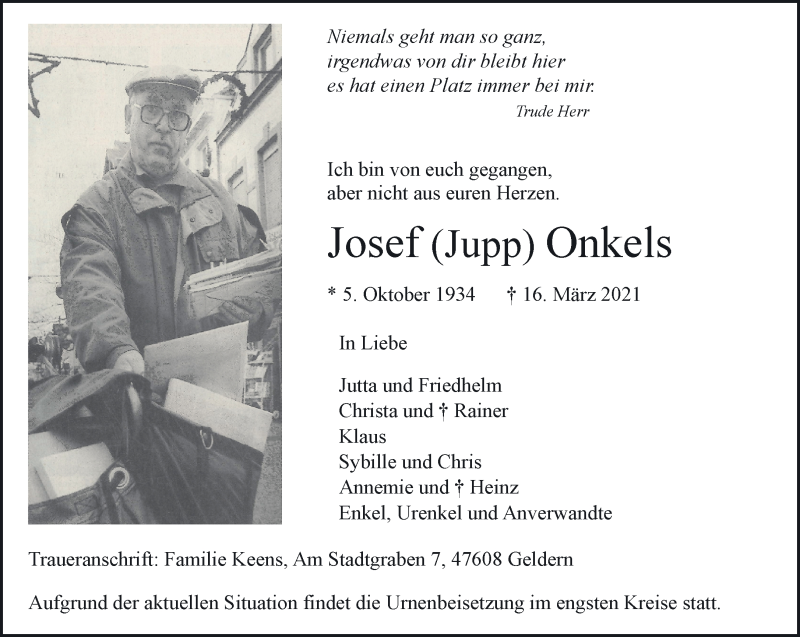 Hier finden Sie alle Traueranzeigen aus der Zeitung, die bisher für Josef Onkels erschienen sind. Weitere Traueranzeigen, die in der Zeitung erscheinen, werden hier ebenfalls aufgelistet