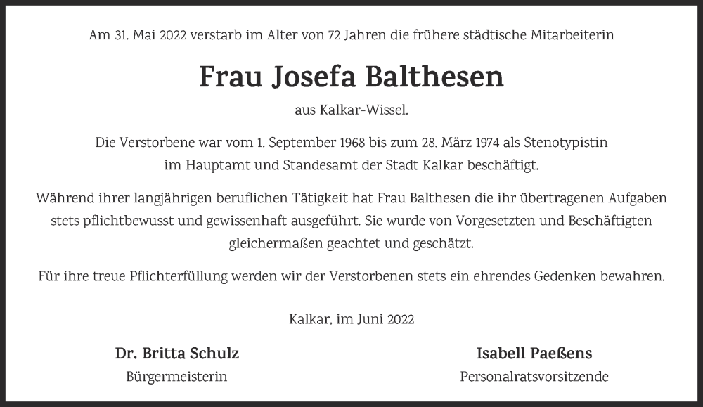 Hier finden Sie alle Traueranzeigen aus der Zeitung, die bisher für Josefa Balthesen erschienen sind. Weitere Traueranzeigen, die in der Zeitung erscheinen, werden hier ebenfalls aufgelistet
