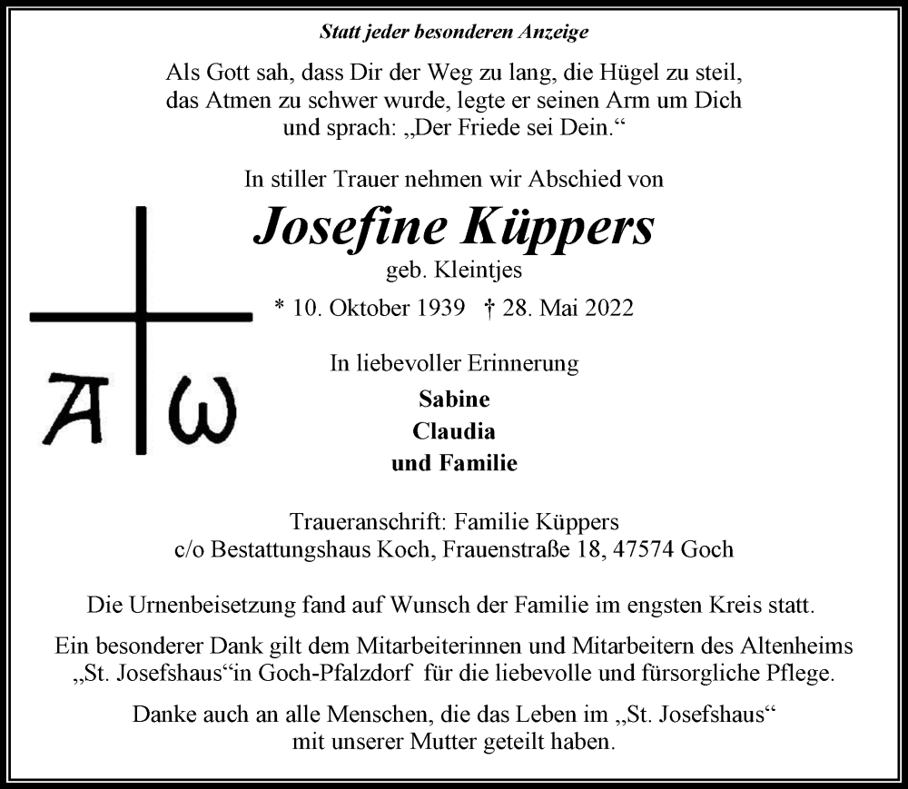 Hier finden Sie alle Traueranzeigen aus der Zeitung, die bisher für Josefine Küppers erschienen sind. Weitere Traueranzeigen, die in der Zeitung erscheinen, werden hier ebenfalls aufgelistet