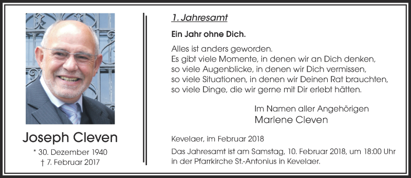 Hier finden Sie alle Traueranzeigen aus der Zeitung, die bisher für Joseph Cleven erschienen sind. Weitere Traueranzeigen, die in der Zeitung erscheinen, werden hier ebenfalls aufgelistet