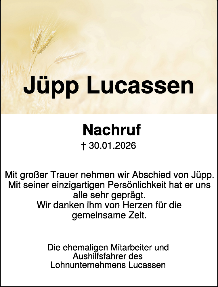 Hier finden Sie alle Traueranzeigen aus der Zeitung, die bisher für Jüpp Lucassen erschienen sind. Weitere Traueranzeigen, die in der Zeitung erscheinen, werden hier ebenfalls aufgelistet