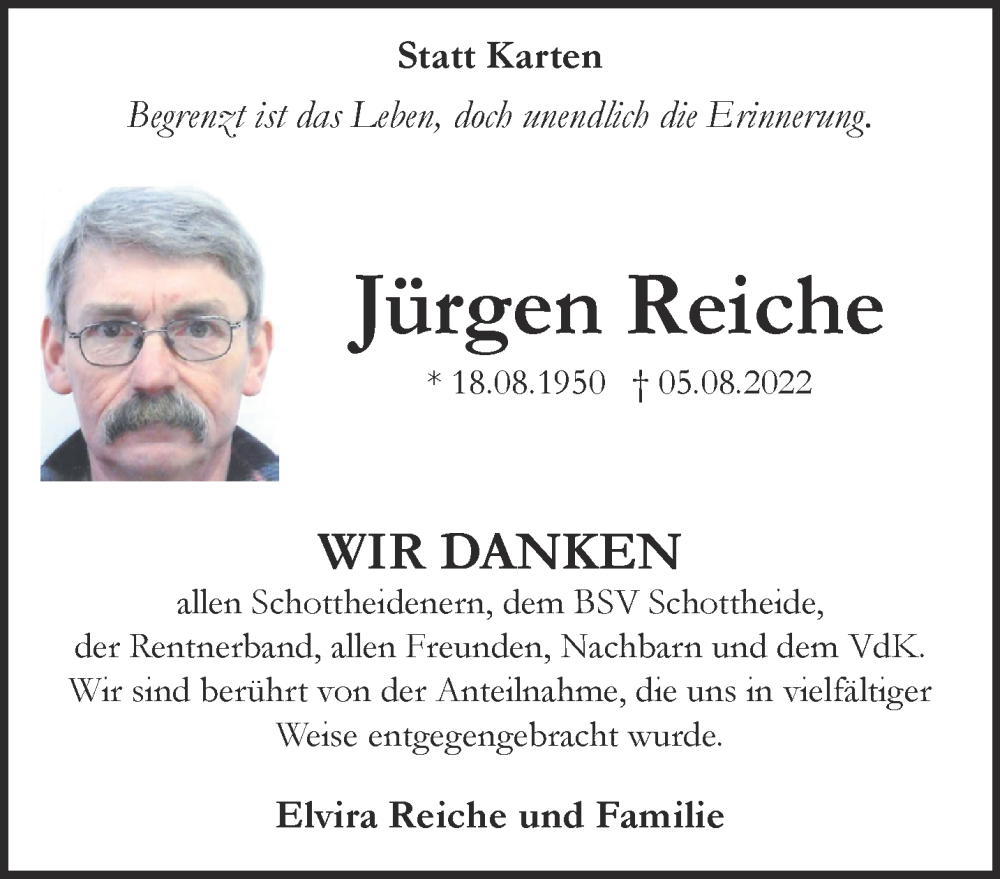 Hier finden Sie alle Traueranzeigen aus der Zeitung, die bisher für Jürgen Reiche erschienen sind. Weitere Traueranzeigen, die in der Zeitung erscheinen, werden hier ebenfalls aufgelistet