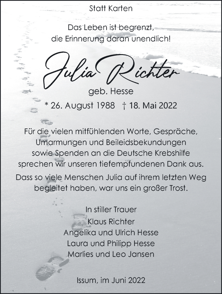Hier finden Sie alle Traueranzeigen aus der Zeitung, die bisher für Julia Richter erschienen sind. Weitere Traueranzeigen, die in der Zeitung erscheinen, werden hier ebenfalls aufgelistet