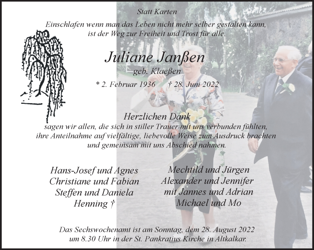 Hier finden Sie alle Traueranzeigen aus der Zeitung, die bisher für Juliane Janßen erschienen sind. Weitere Traueranzeigen, die in der Zeitung erscheinen, werden hier ebenfalls aufgelistet