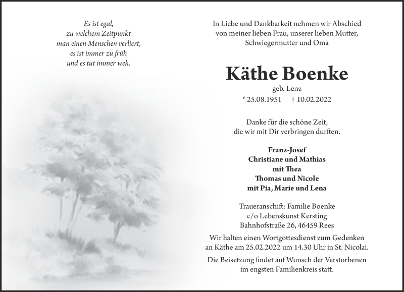 Hier finden Sie alle Traueranzeigen aus der Zeitung, die bisher für Käthe Boenke erschienen sind. Weitere Traueranzeigen, die in der Zeitung erscheinen, werden hier ebenfalls aufgelistet