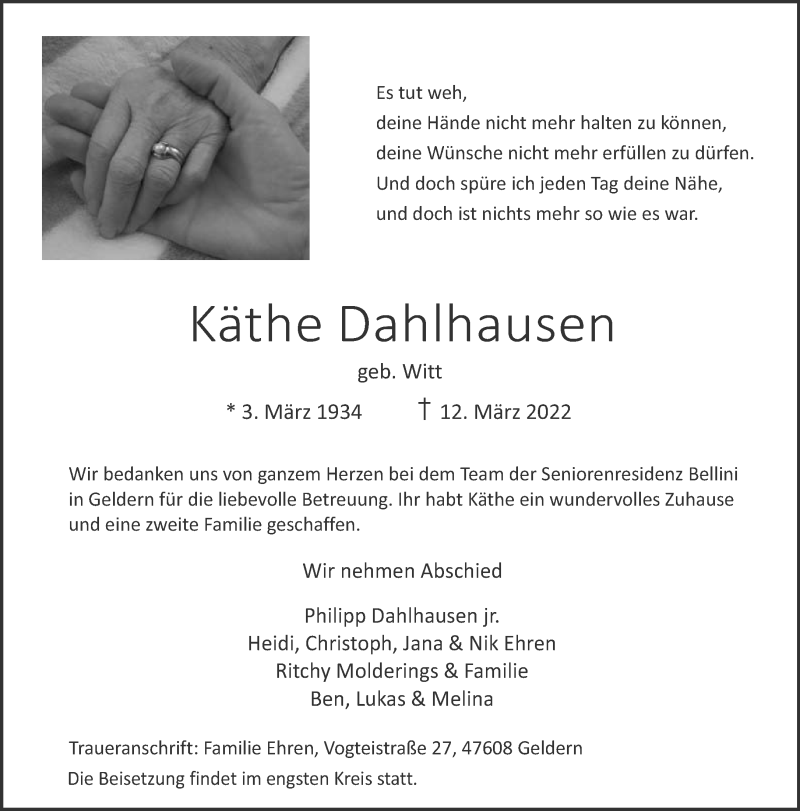 Hier finden Sie alle Traueranzeigen aus der Zeitung, die bisher für Käthe Dahlhausen erschienen sind. Weitere Traueranzeigen, die in der Zeitung erscheinen, werden hier ebenfalls aufgelistet