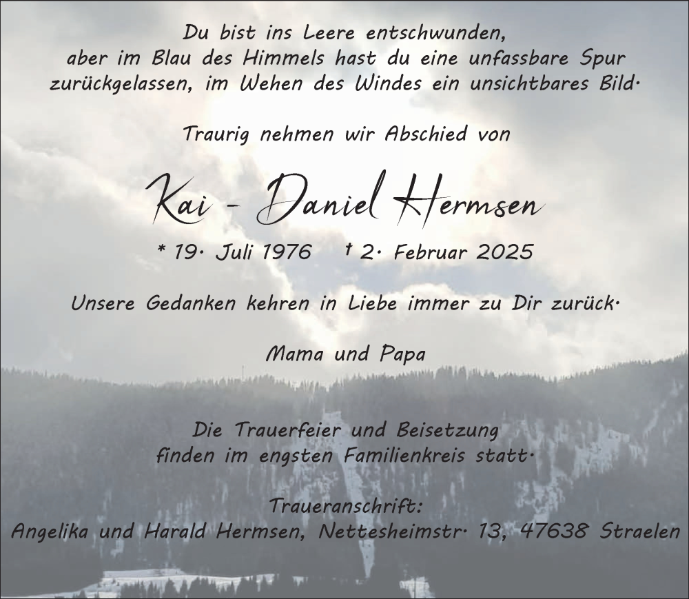 Hier finden Sie alle Traueranzeigen aus der Zeitung, die bisher für Kai-Daniel Hermsen erschienen sind. Weitere Traueranzeigen, die in der Zeitung erscheinen, werden hier ebenfalls aufgelistet
