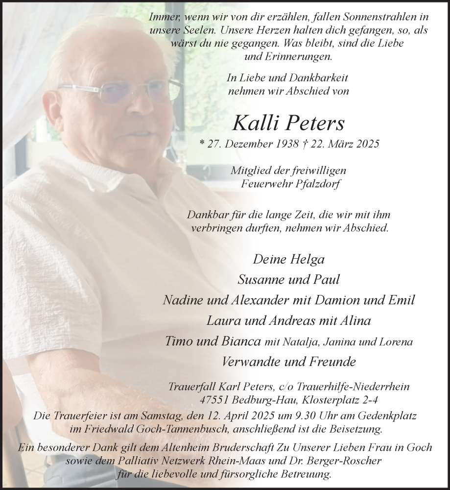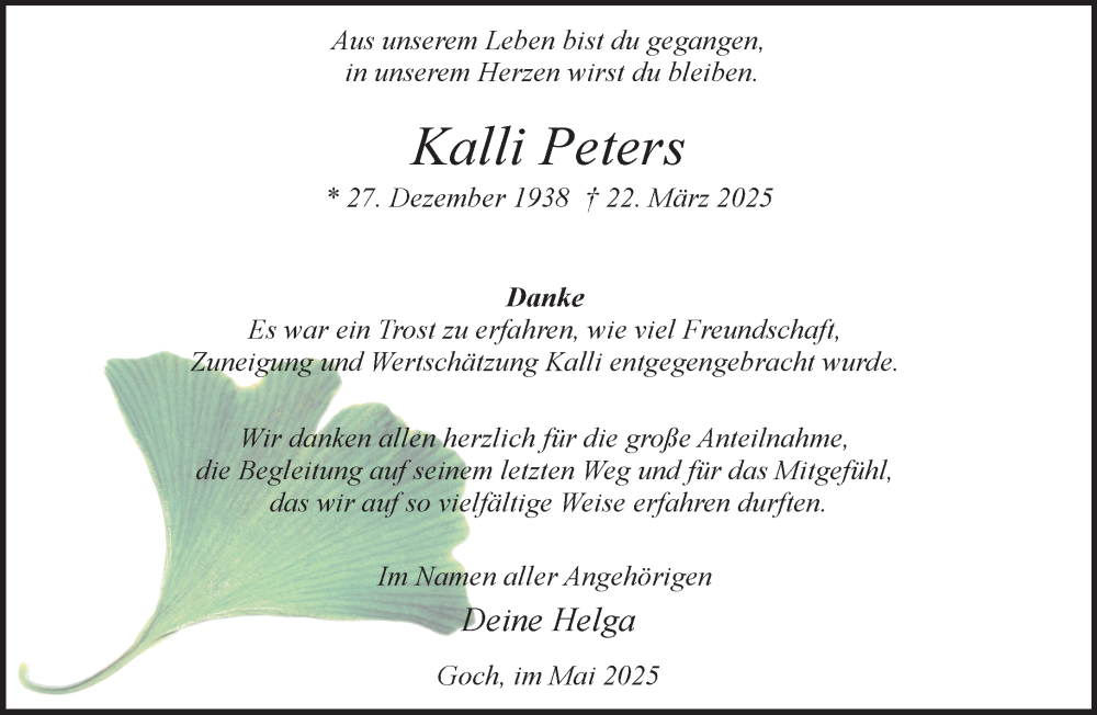 Hier finden Sie alle Traueranzeigen aus der Zeitung, die bisher für Kalli Peters erschienen sind. Weitere Traueranzeigen, die in der Zeitung erscheinen, werden hier ebenfalls aufgelistet