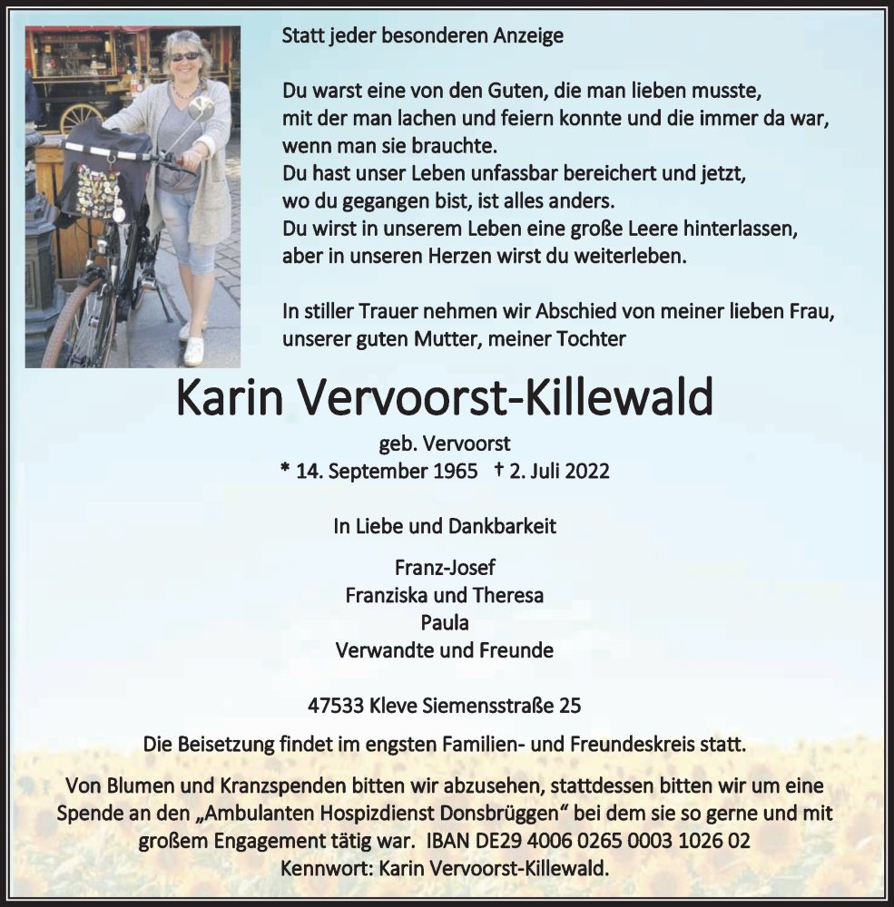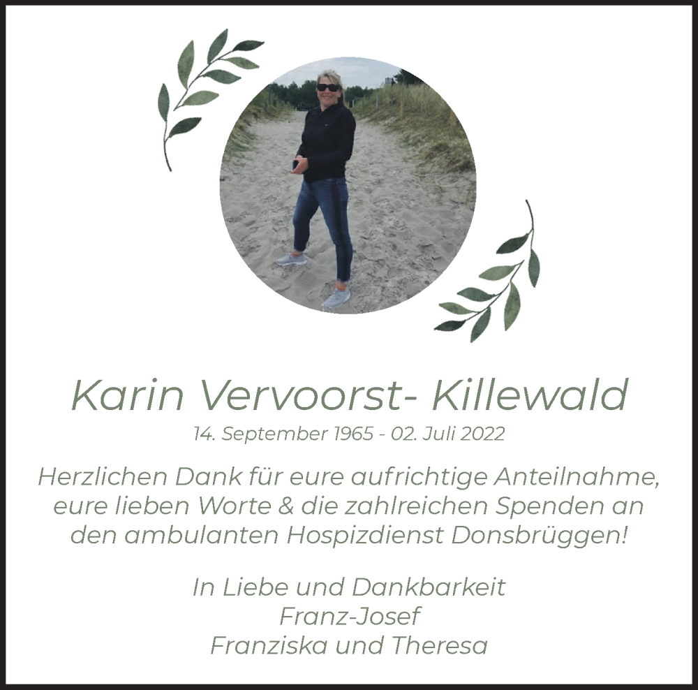 Hier finden Sie alle Traueranzeigen aus der Zeitung, die bisher für Karin Vervoorst-Killewald erschienen sind. Weitere Traueranzeigen, die in der Zeitung erscheinen, werden hier ebenfalls aufgelistet