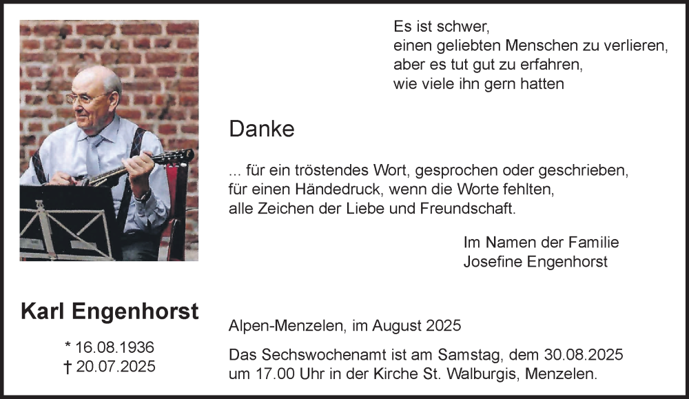Hier finden Sie alle Traueranzeigen aus der Zeitung, die bisher für Karl Engenhorst erschienen sind. Weitere Traueranzeigen, die in der Zeitung erscheinen, werden hier ebenfalls aufgelistet